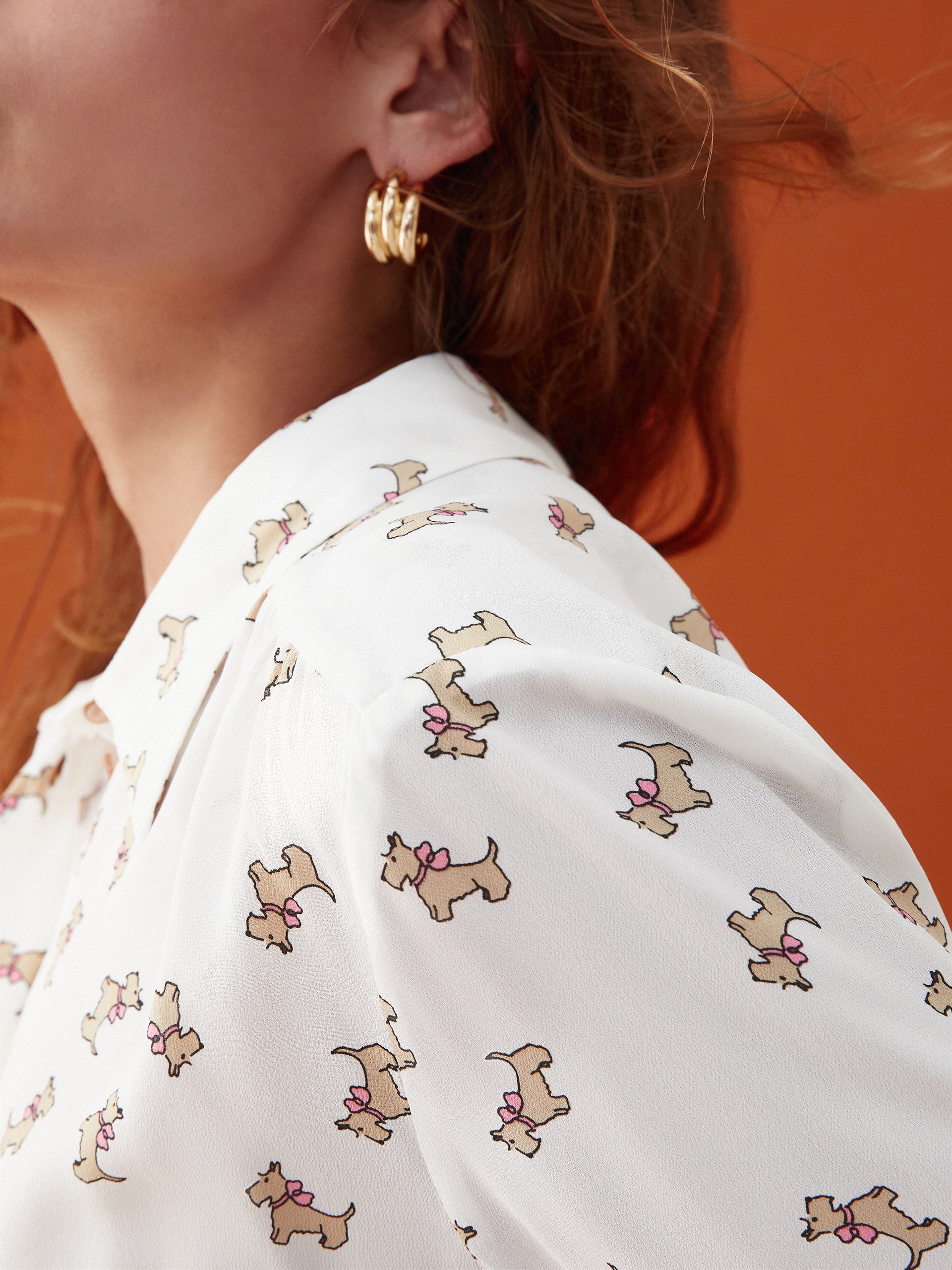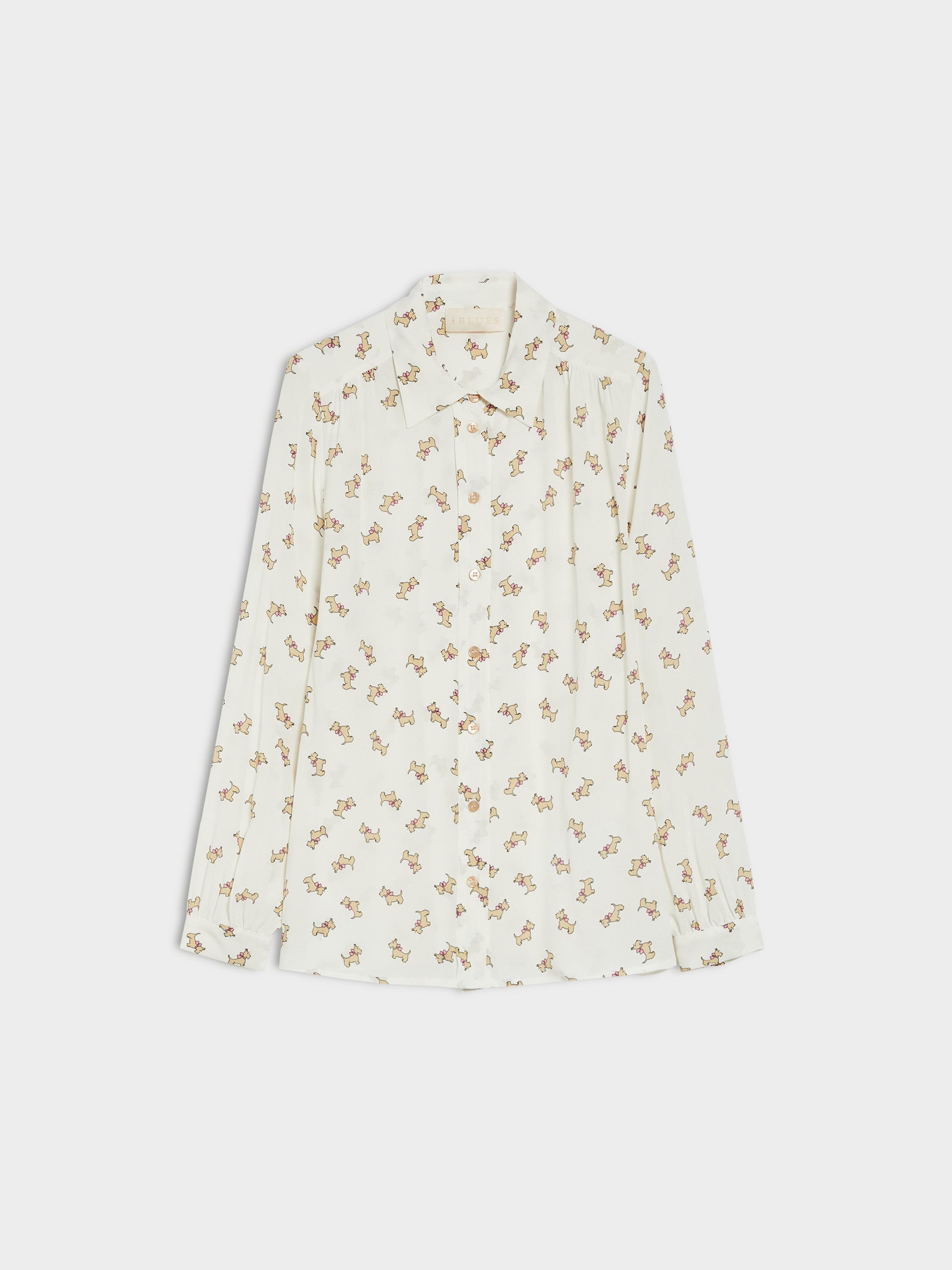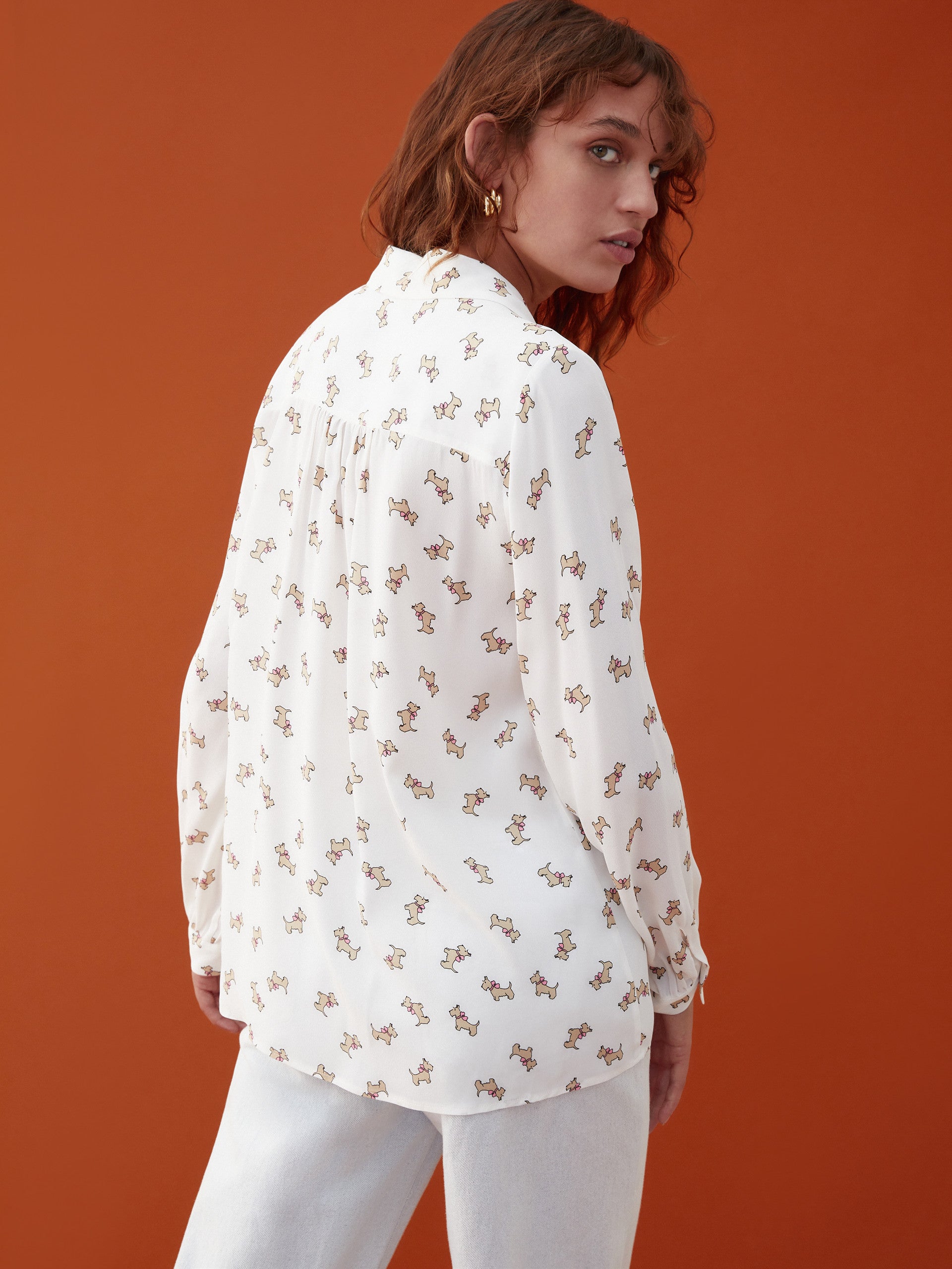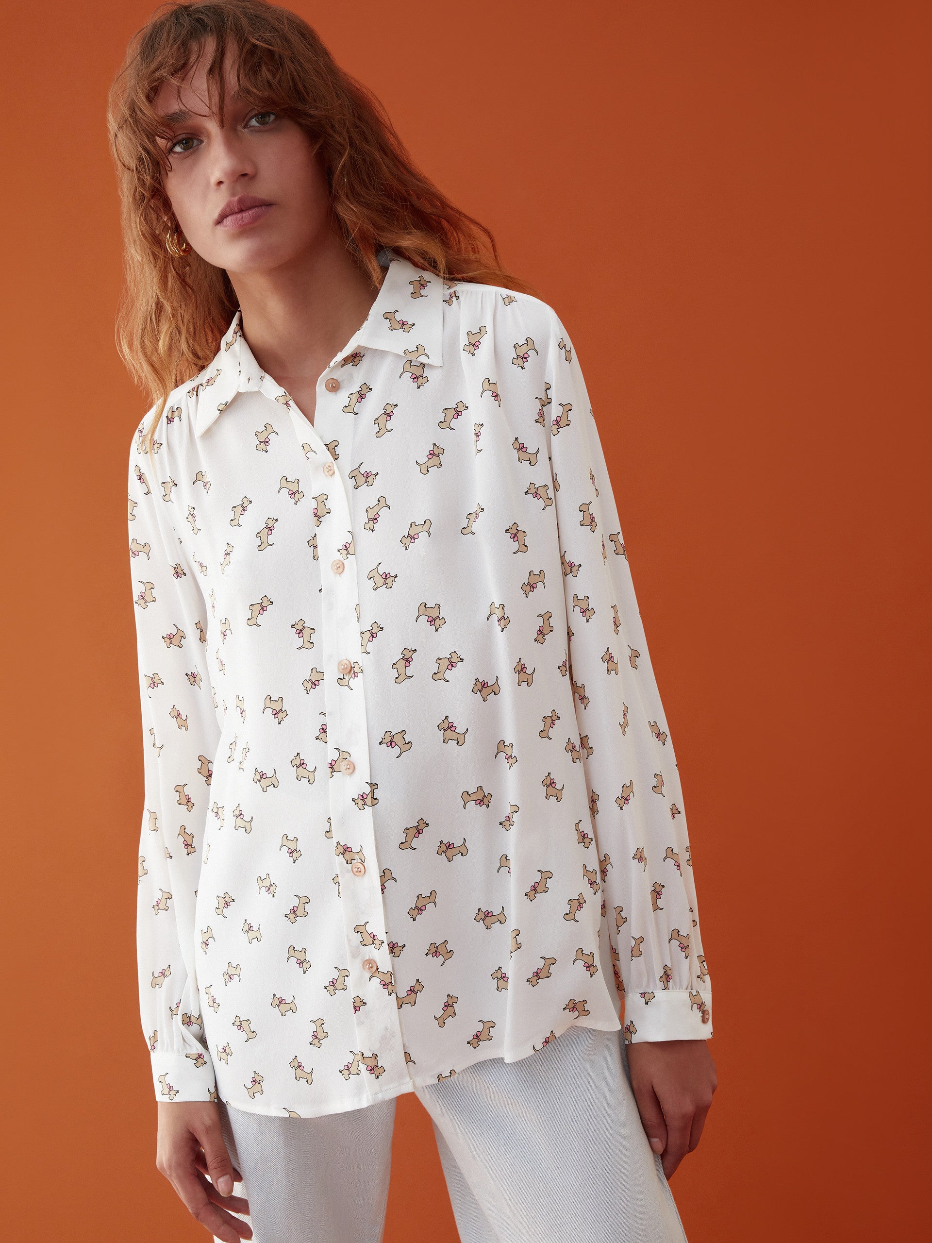 Camicia in crêpe fluido stampato dalla linea scivolata, chiusa con bottoni. Colletto e maniche lunghe.