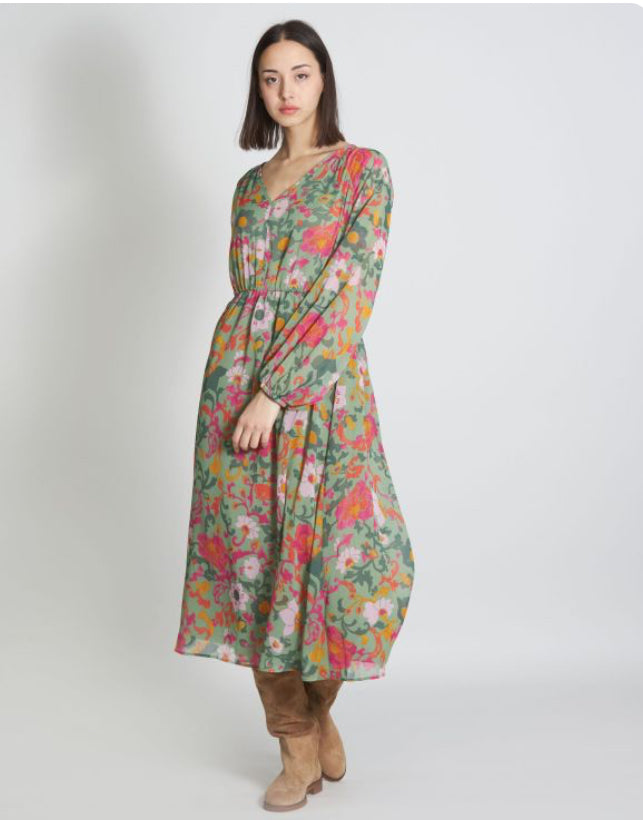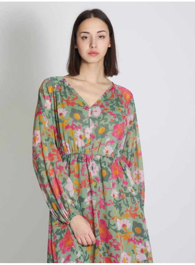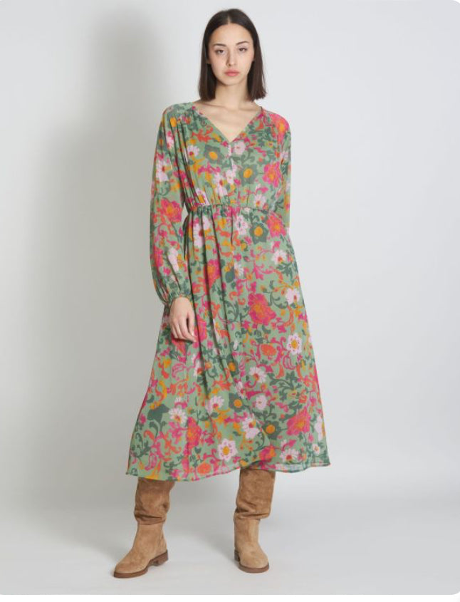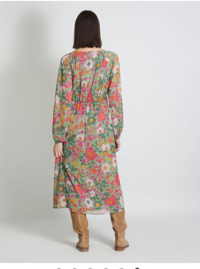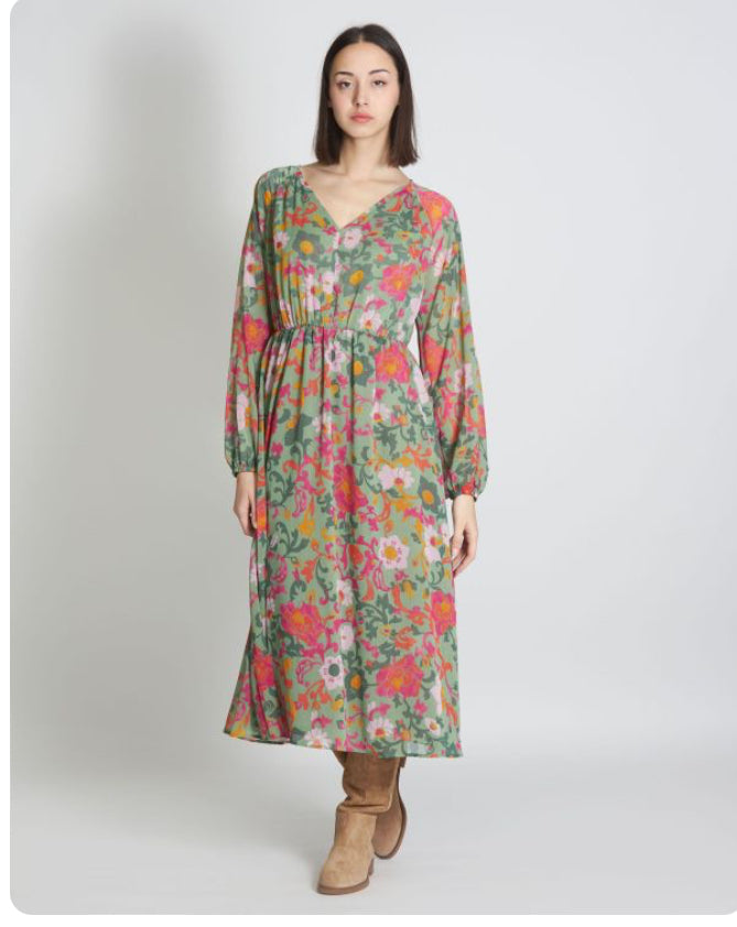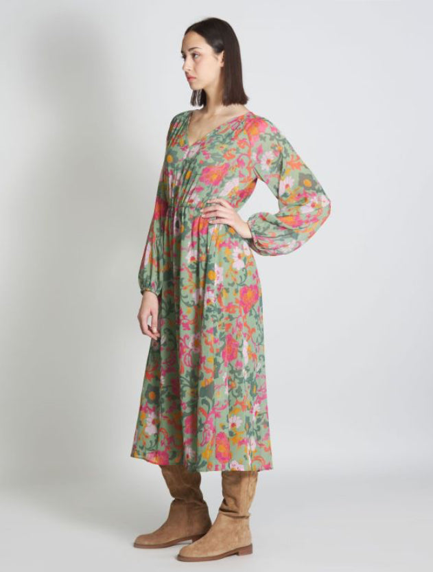 Abito verde in georgette a fantasia, scollo a V, maniche lunghe con elastico inserito sul fondo, linea svasata con vita elastica, foderato,