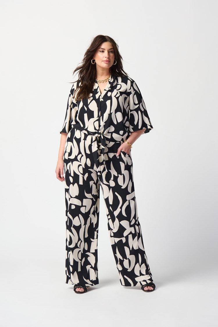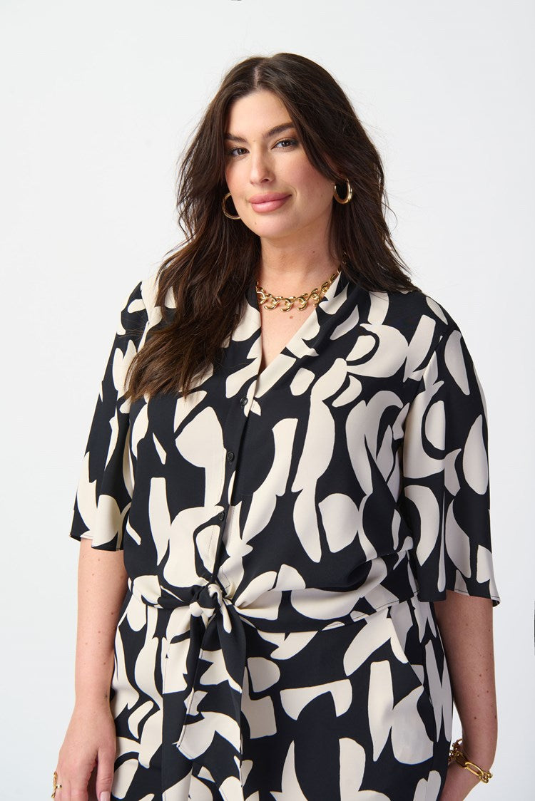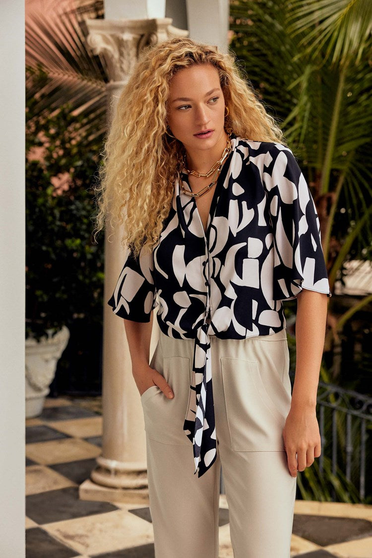 Questa blusa sartoriale stampata è decorata da un delizioso motivo astratto che darà al tuo look una marcia in più. Il suo tessuto leggero è carezzevole al tatto a ogni passo, mentre l accattivante scollo a V e le graziose maniche a tre quarti a campana rifiniscono il taglio dritto del capo.