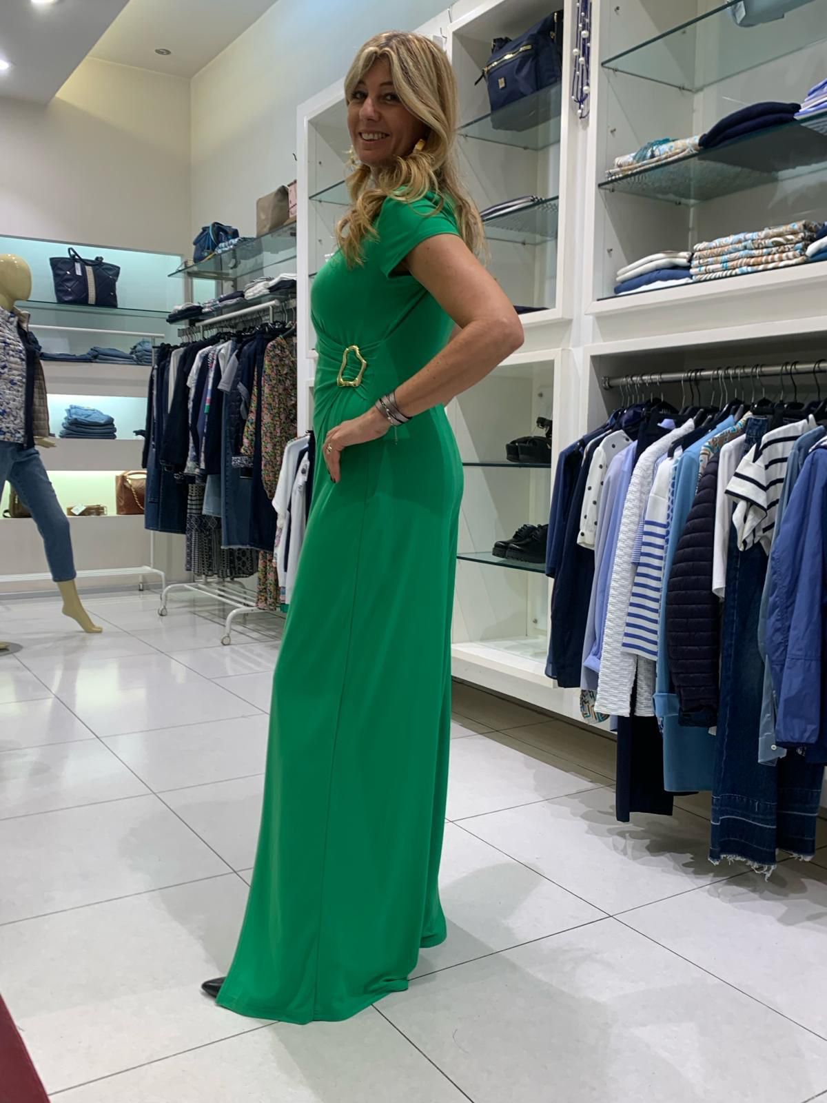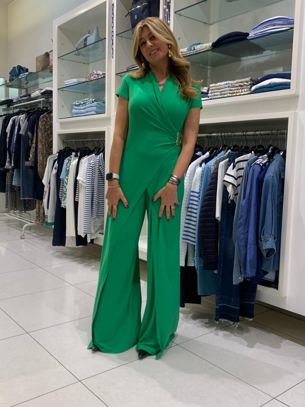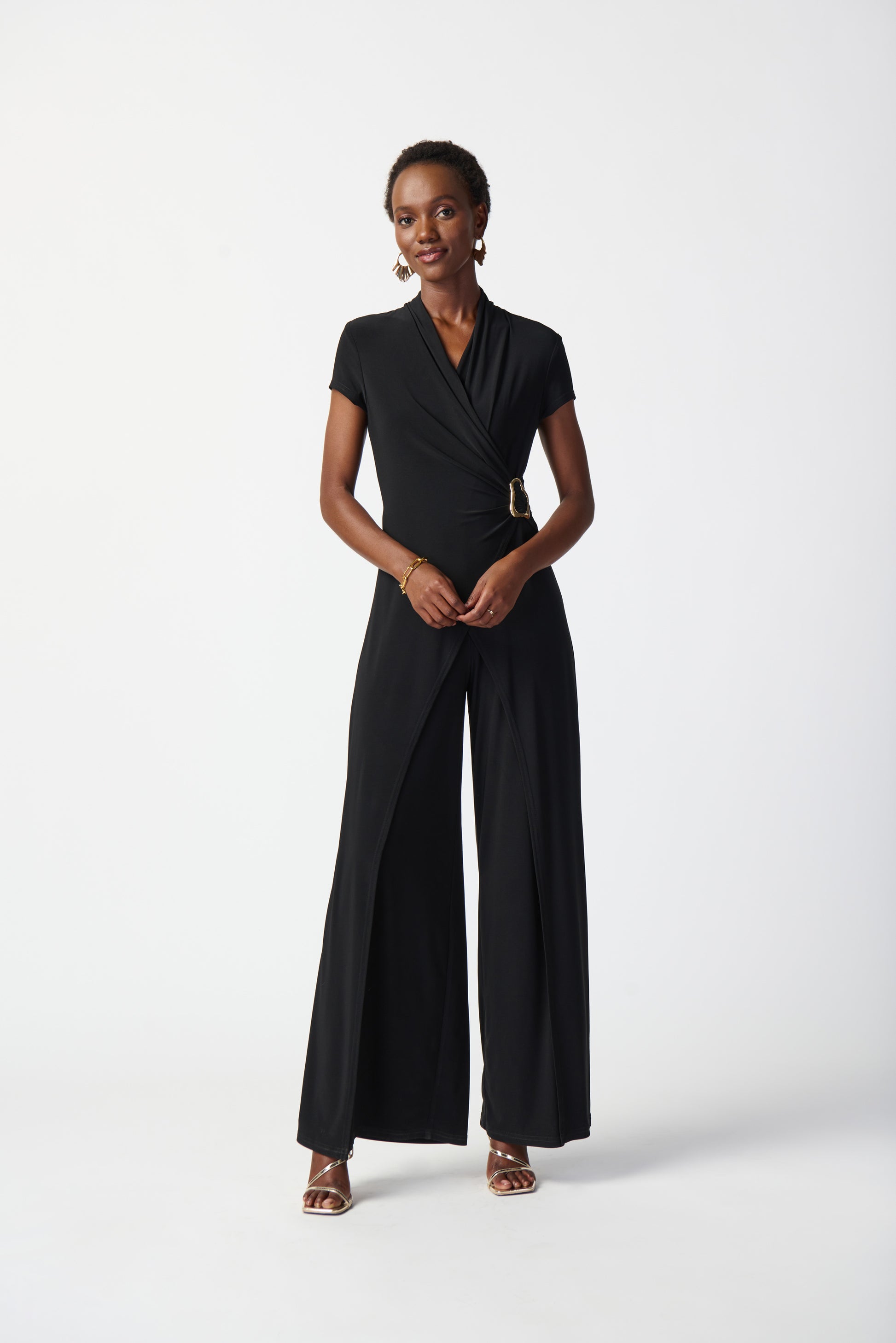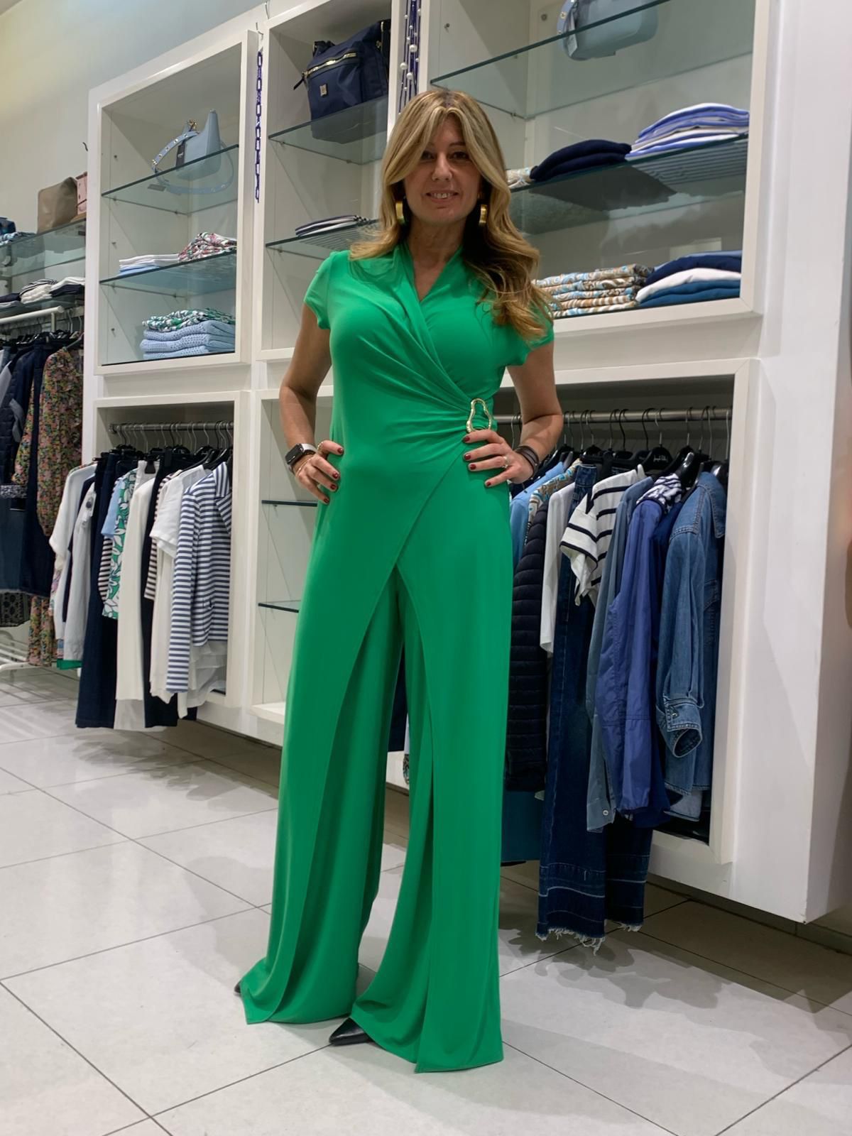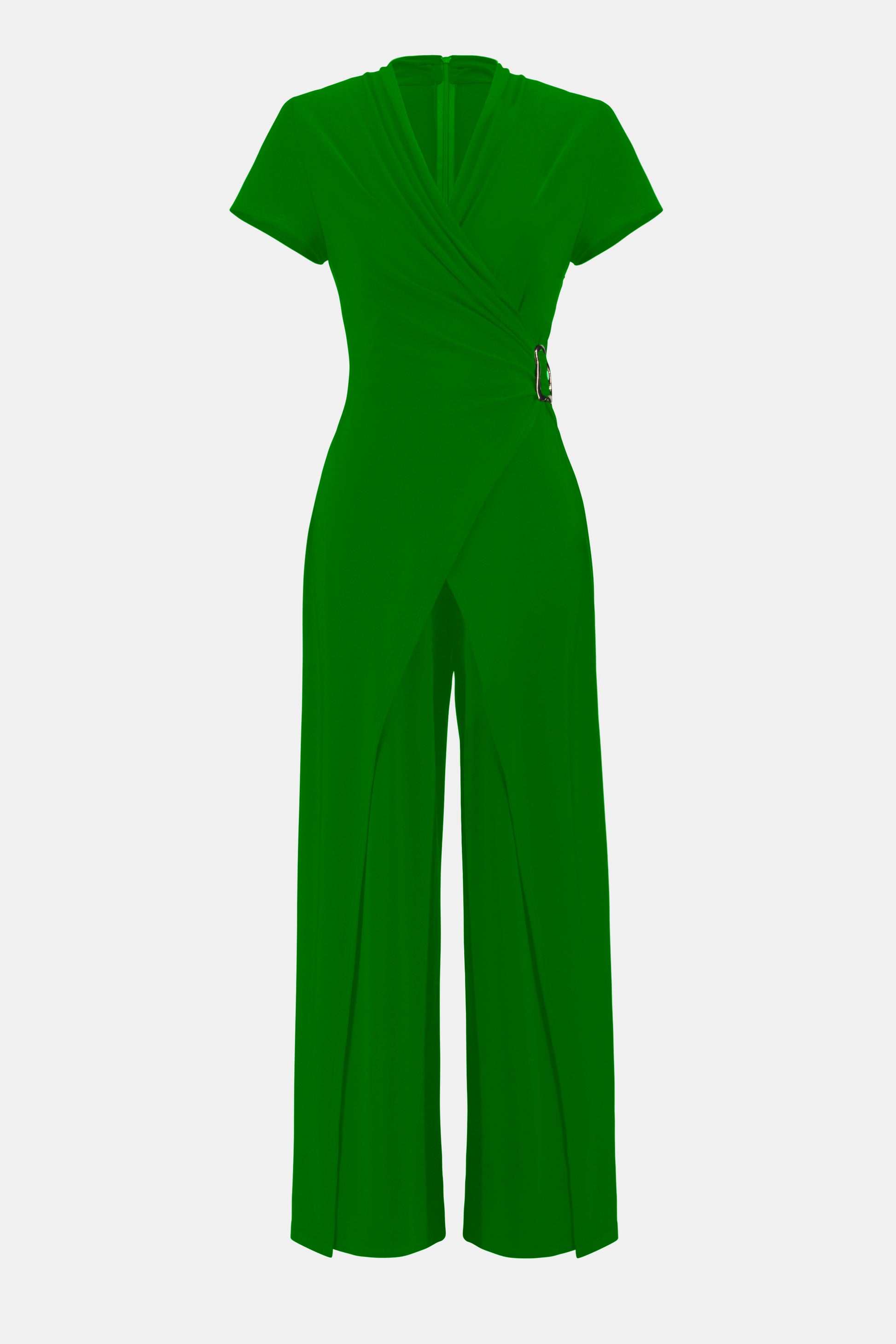 Sprigiona eleganza a ogni passo indossando questa tuta in maglia effetto seta. Autentico segno distintivo dell affascinante femminilità vintage, è stata splendidamente realizzata con un taglio a gamba larga e con un elegante fibbia che sottolinea il punto vita. La scollo a portafoglio e le maniche corte ad aletta impreziosiscono il modello e gli conferiscono un innegabile fascino senza tempo.