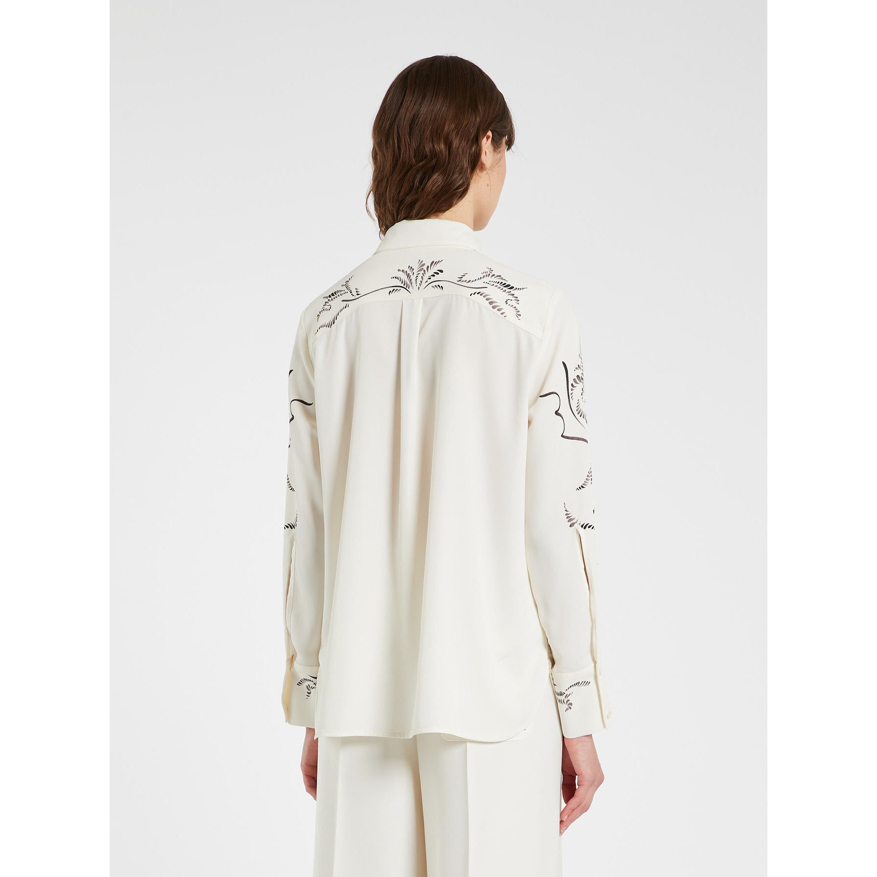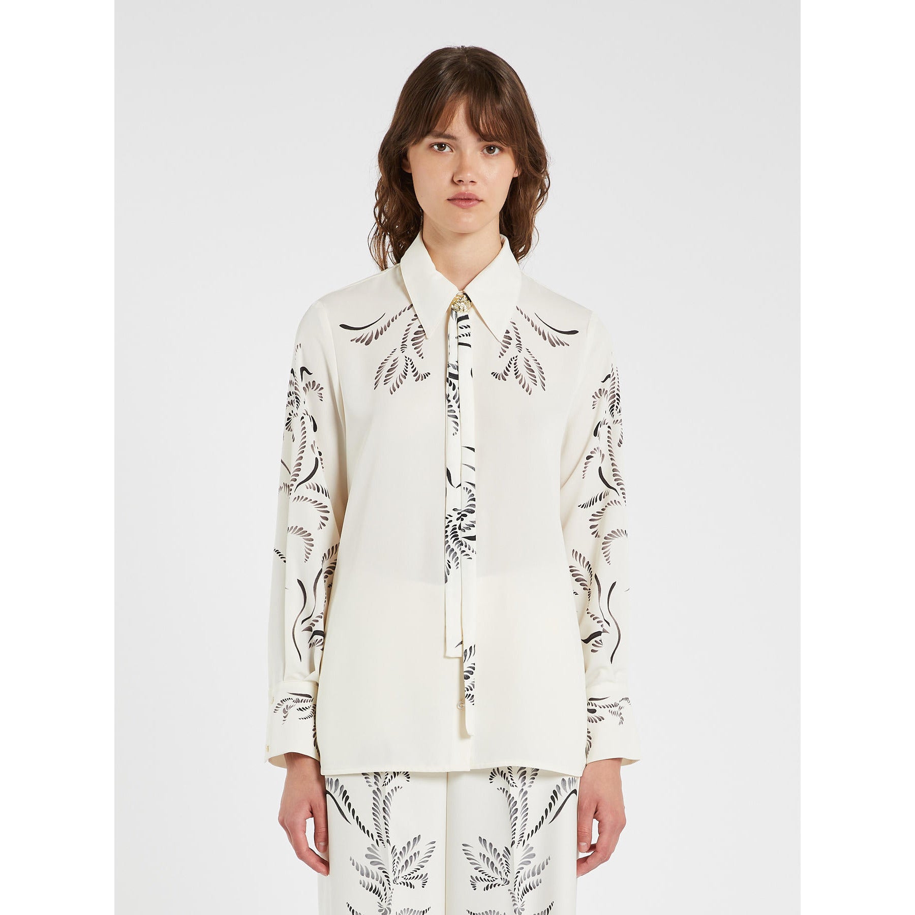 Easy & chic: impossibile resistere al fascino della camicia in satin, con stampe foliage a contrasto. Annoda la fusciacca al collo per una nota coquette. Il capo fa parte della capsule seasonless Marella ART.365.
