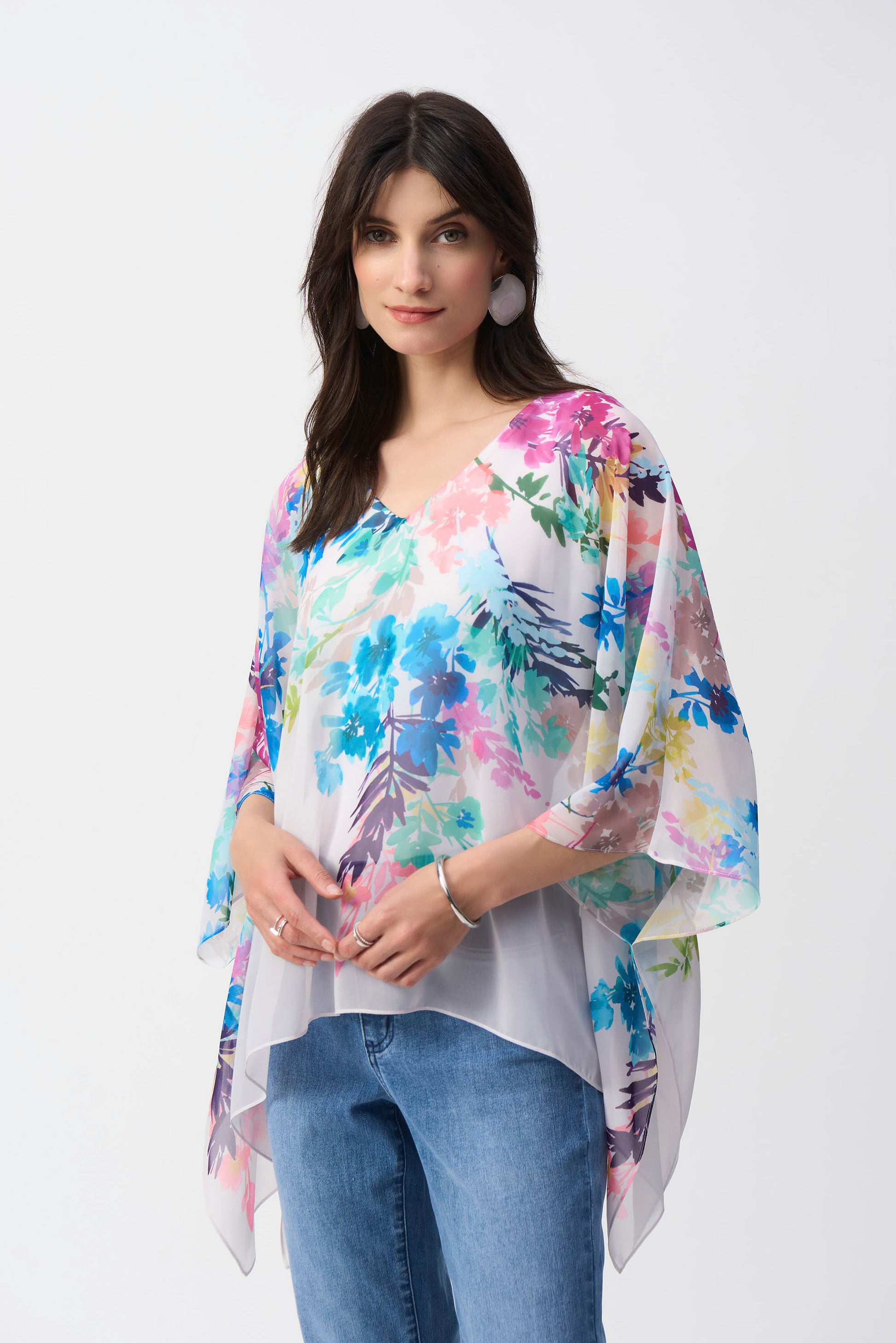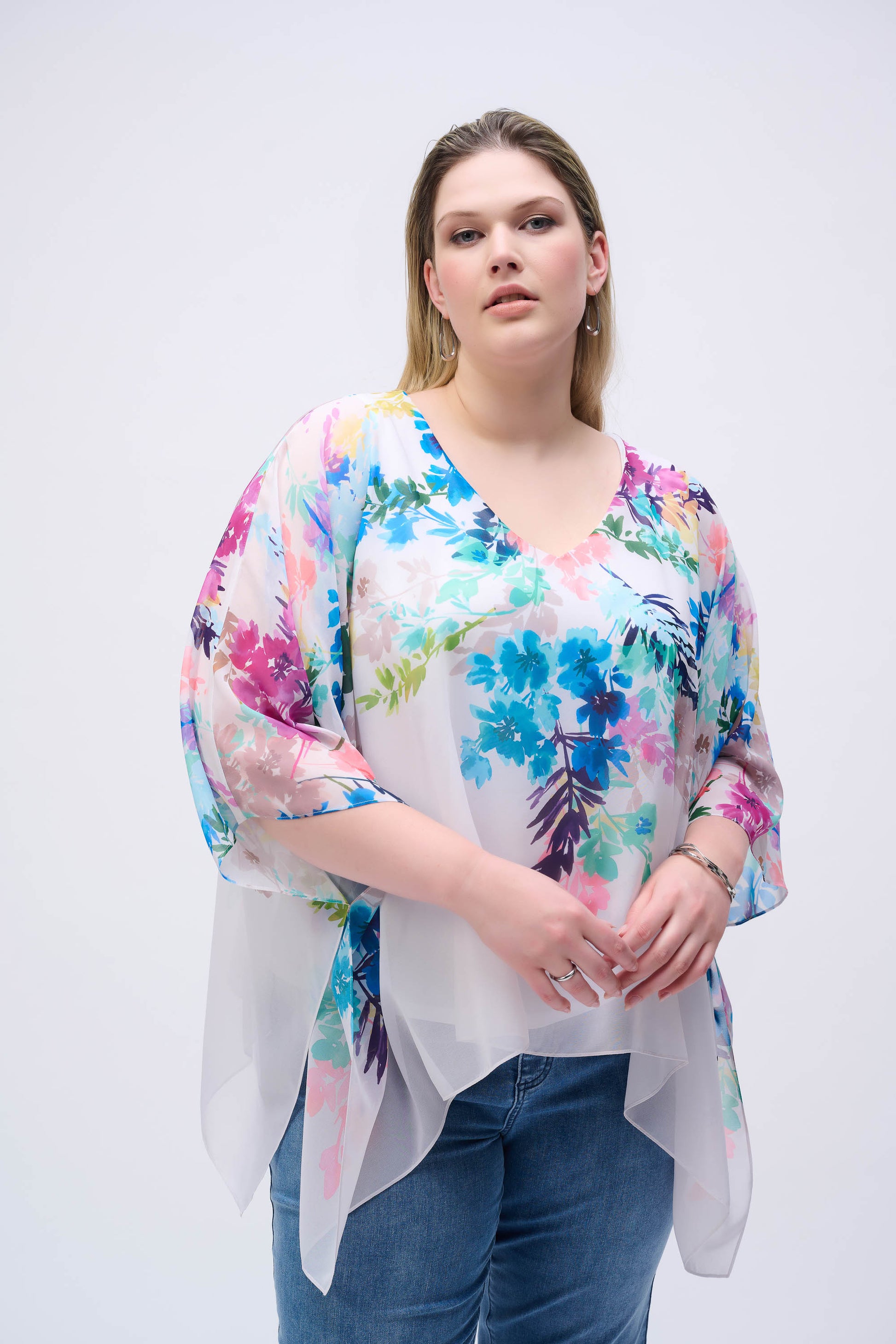 Ecco la blusa bohémien Joseph Ribkoff, un mix perfetto di stile e comfort. Questo top dalla vestibilità ampia e lungo fino ai fianchi presenta una scollatura a V e un orlo asimmetrico, aggiungendo un tocco di eleganza al tuo guardaroba casual. Il motivo floreale, le maniche a kimono a tre quarti e il design femminile lo rendono una scelta ideale per ogni occasione. Abbraccia l eleganza senza sforzo con questo capo unico.