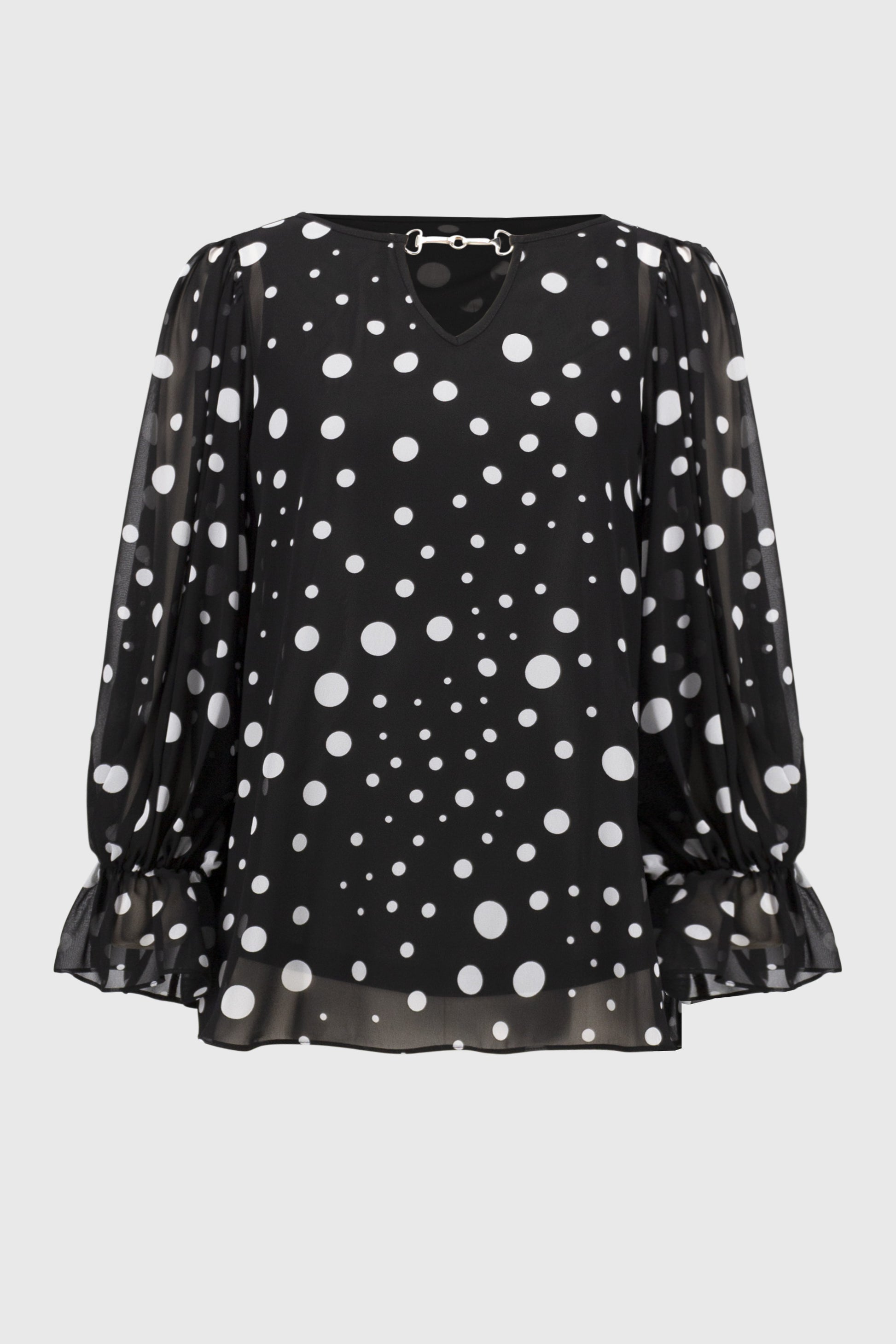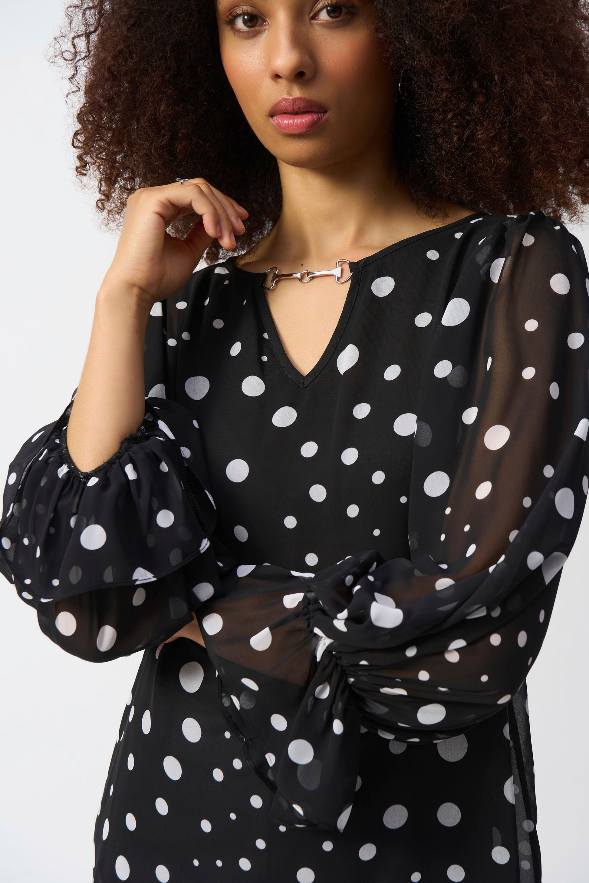 Scopri il mix perfetto tra chic e casual con questa casacca Joseph Ribkoff. Pensato sia per l ufficio che per le occasioni casual, presenta uno scollo a V e una vestibilità regolare fino ai fianchi. Il motivo a pois, il dettaglio del buco della serratura e la barra metallica aggiungono un tocco di eleganza, mentre le maniche lunghe a sbuffo assicurano un look elegante. Abbraccia il comfort e la raffinatezza senza sforzo con questo pezzo imperdibile.