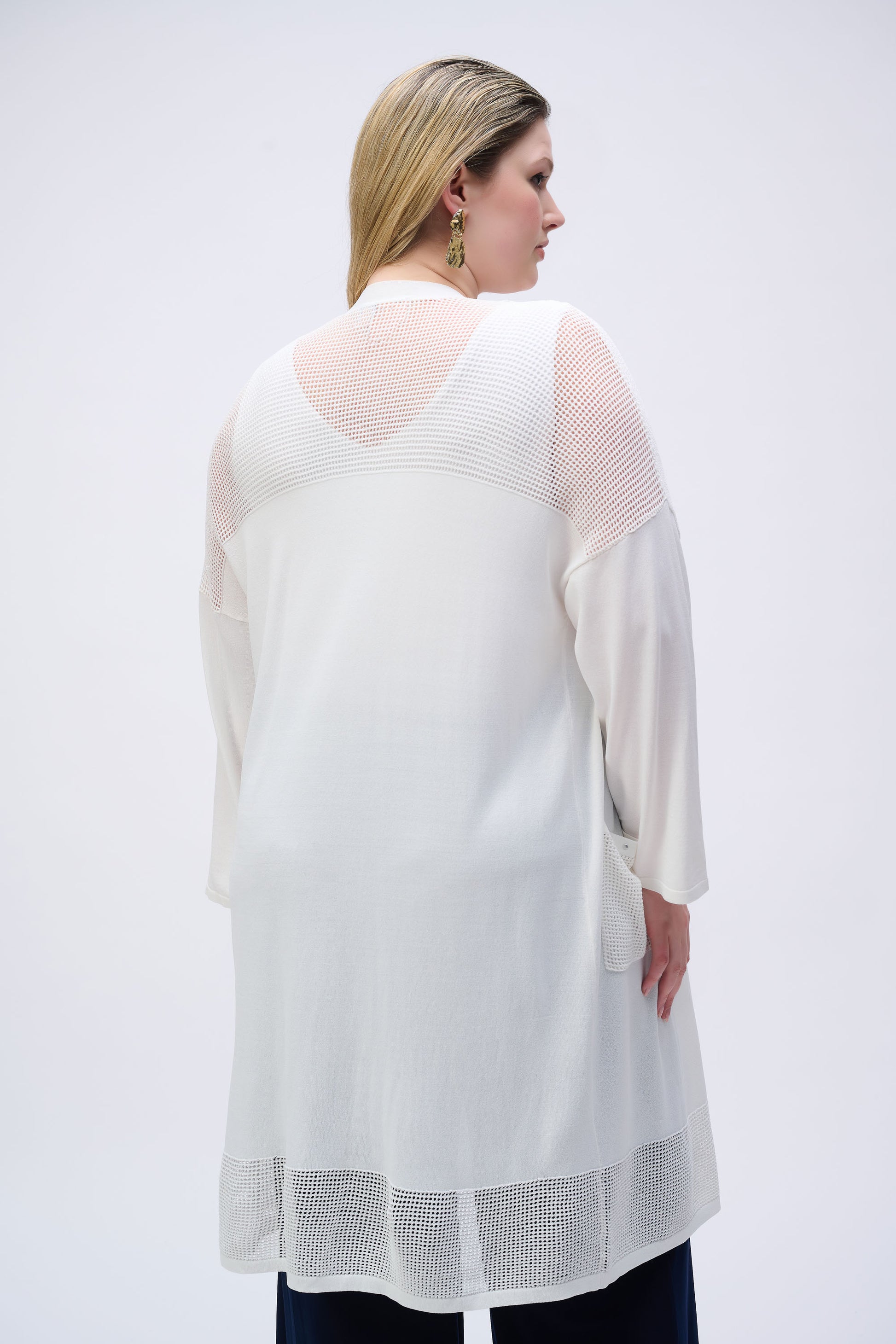 Questo soprabito in maglia è tutt altro che banale, con le sue raffinate cuciture traforate sui carré e sull orlo. Il modello aperto sul davanti, le maniche a tre quarti e le tasche applicate decorate si combinano per creare una versione elegante di questo capo tanto amato.
