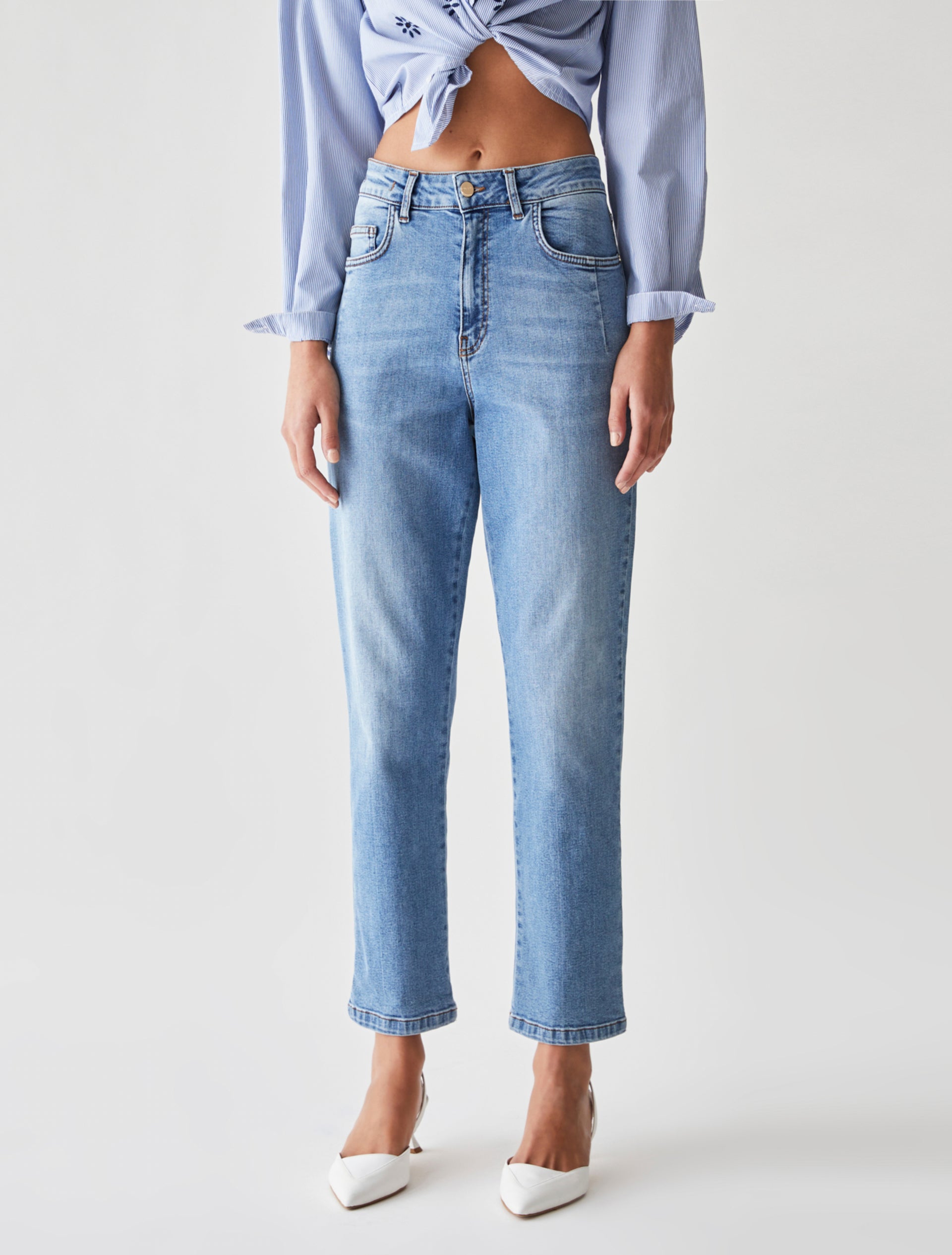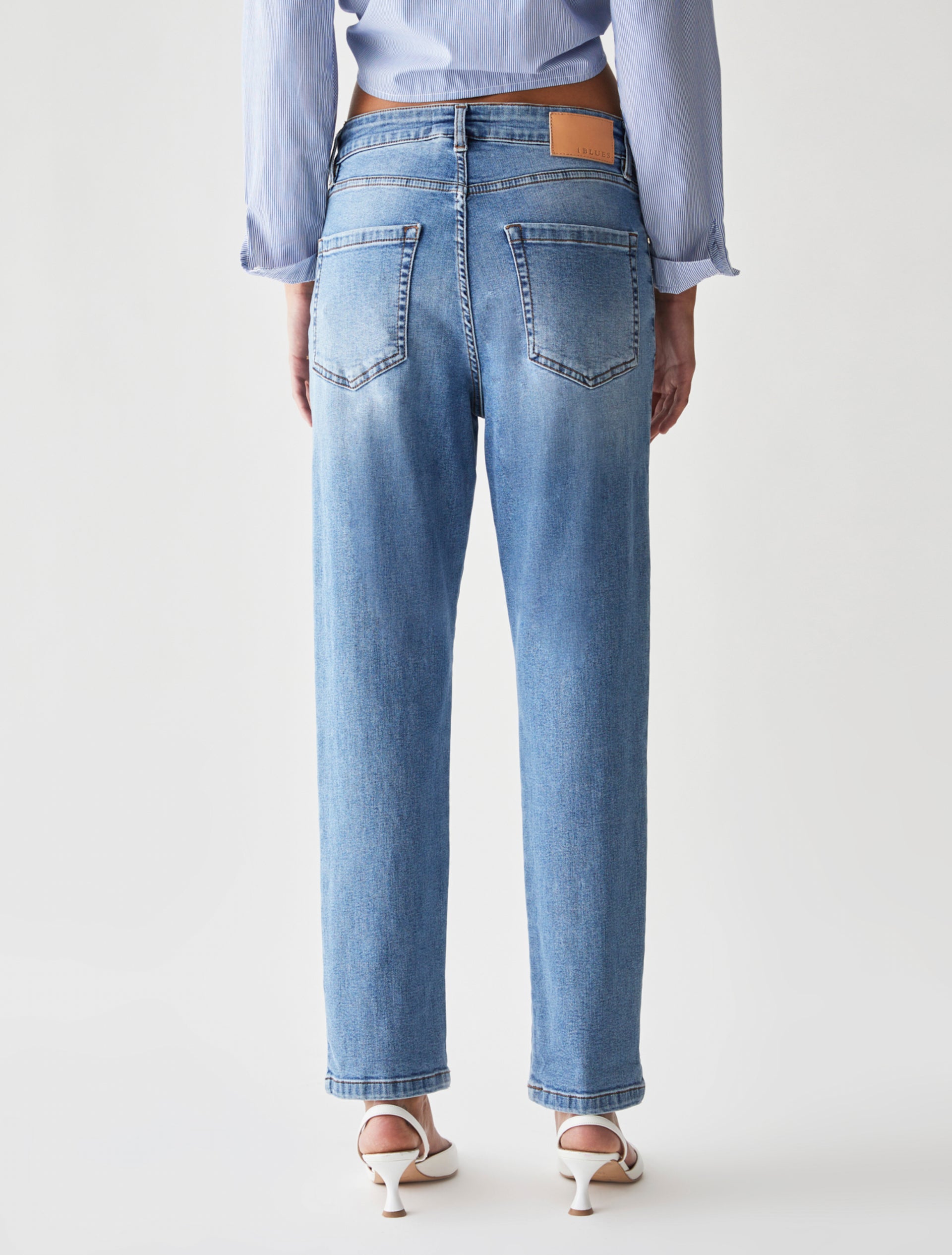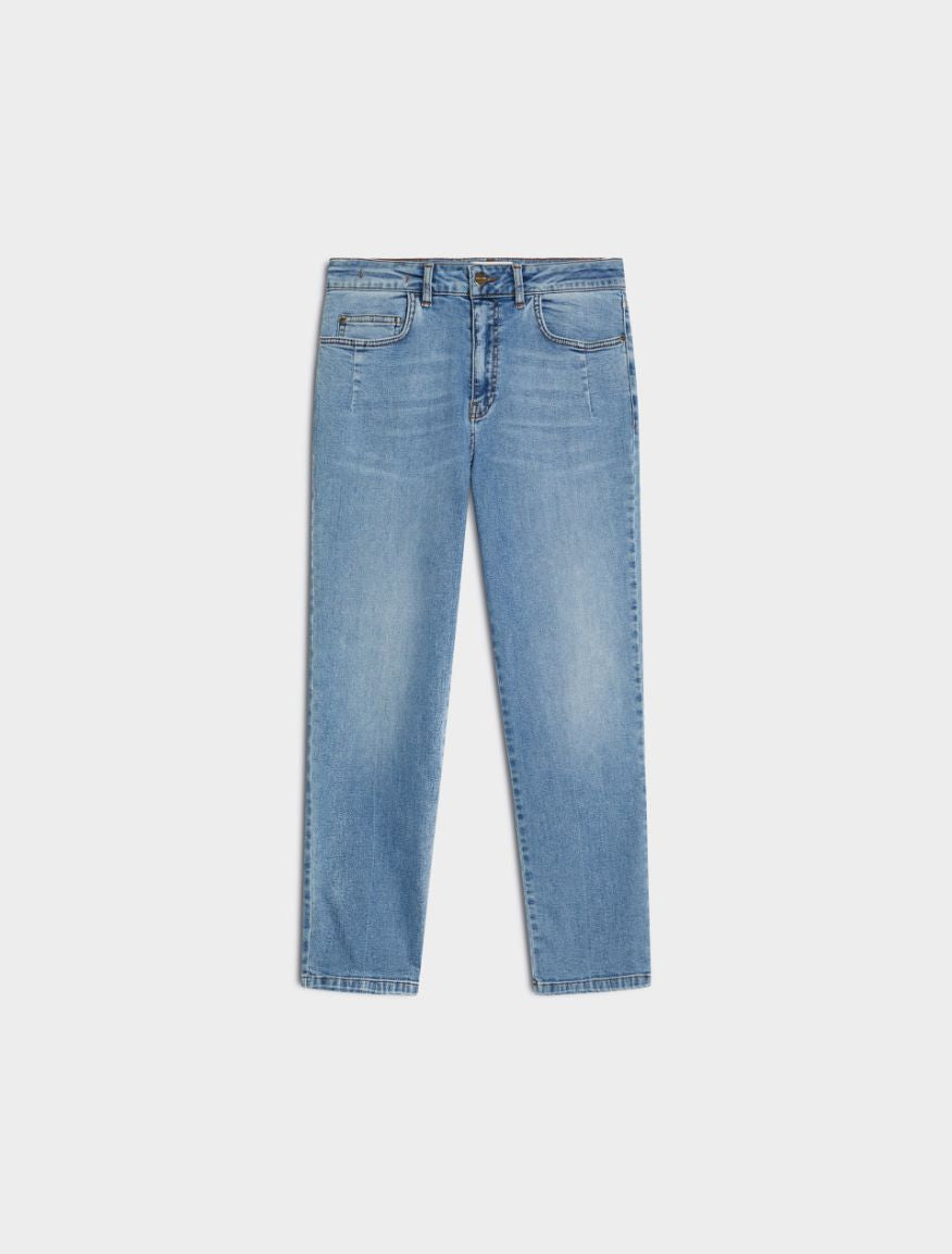 Jeans cinque tasche in denim di cotone stretch dalla linea boyfriend, chiusi con zip e bottone a chiodo. Tessuto contenente cotone proveniente da una catena di fornitori impegnati in un’agricoltura a basso impatto ambientale.